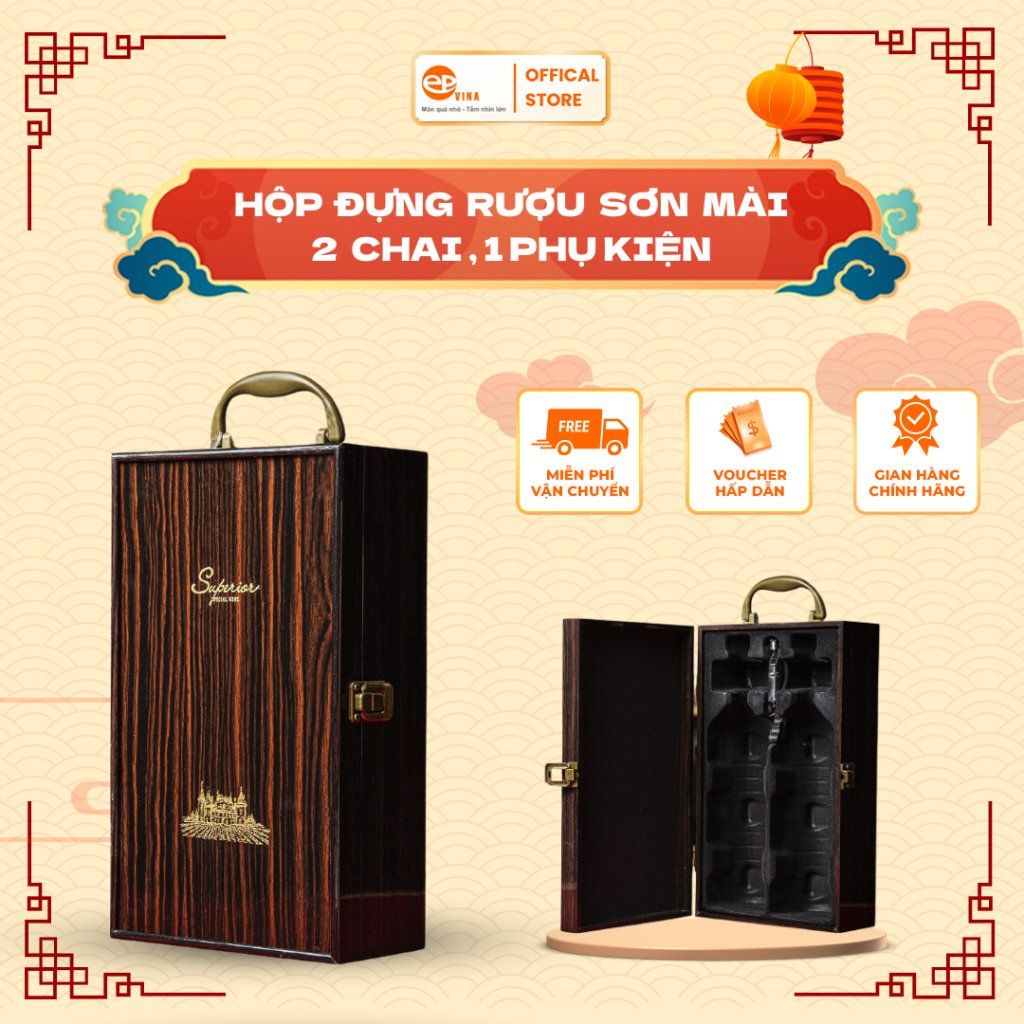 Hộp đựng rượu gỗ sơn mài đôi mặt lõm vườn nho 1 phụ kiện khay hình chai rượu HO4-277-M01