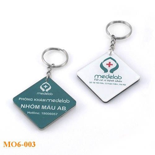 In ấn hình ảnh, logo nhiều màu sắc như yêu cầu, có thể in 1 mặt , 2 mặt các nội dung giống và khác nhau; mỗi góc miếng mica có gắn có gắn móc kim loại để treo vào chùm chìa khóa, cấu tạo là 2 miếng mica ở giữa là phần giấy được in decan nội dung yc